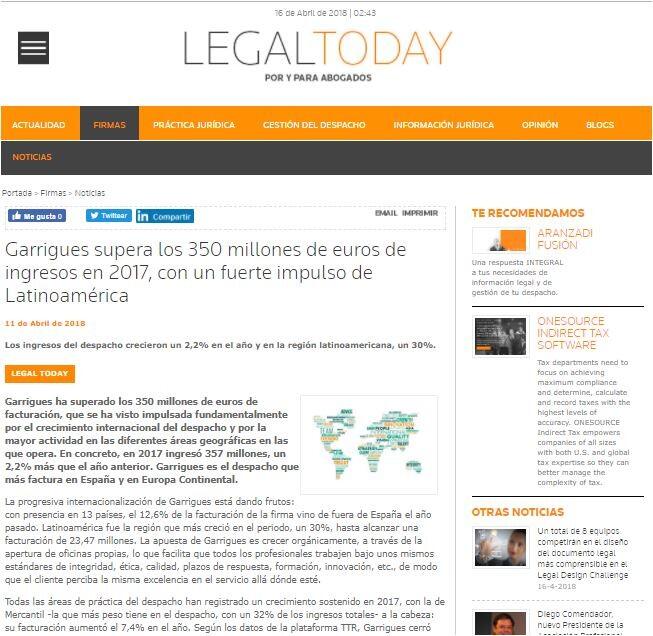 Garrigues ha superado los 350 millones de euros de facturación, que se ha visto impulsada fundamentalmente por el crecimiento internacional del despacho y por la mayor actividad en las diferentes áreas geográficas en las que opera. En concreto, en 2017 ingresó 357 millones, un 2,2% más que el año anterior. Garrigues es el despacho que más factura en España y en Europa Continental.