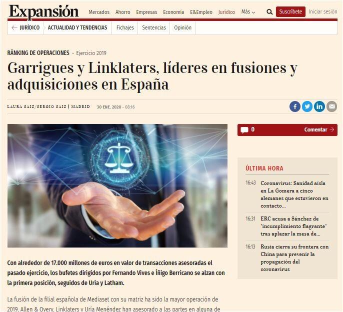 Garrigues y Linklaters, líderes en fusiones y adquisiciones en España