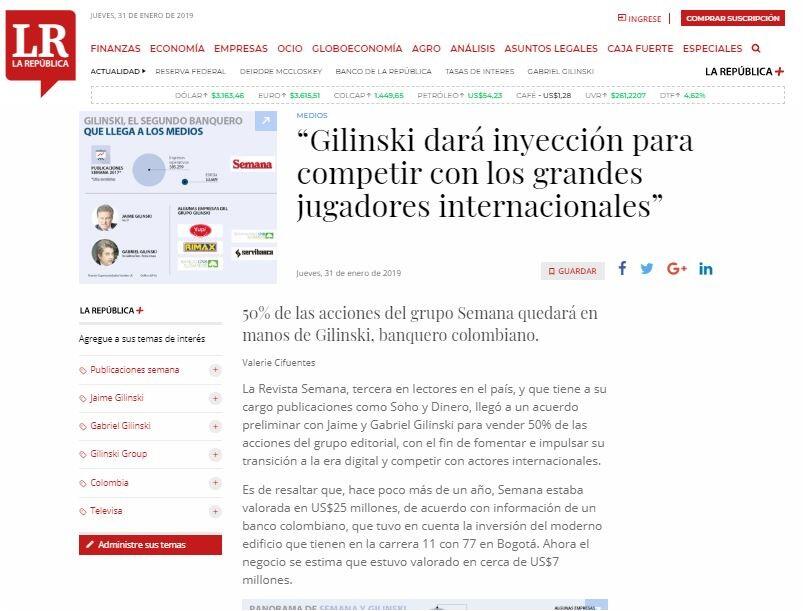 La Revista Semana, tercera en lectores en el país, y que tiene a su cargo publicaciones como Soho y Dinero, llegó a un acuerdo preliminar con Jaime y Gabriel Gilinski para vender 50% de las acciones del grupo editorial, con el fin de fomentar e impulsar su transición a la era digital y competir con actores internacionales.