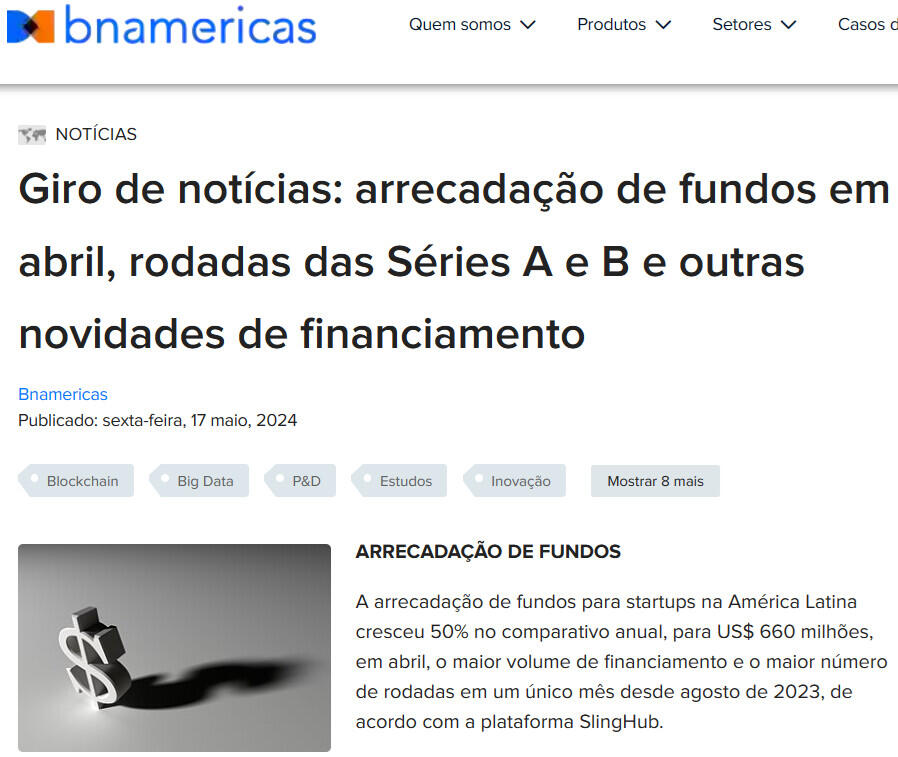 A arrecadação de fundos para startups na América Latina cresceu 50% no comparativo anual, para US$ 660 milhões, em abril, o maior volume de financiamento e o maior número de rodadas em um único mês desde agosto de 2023, de acordo com a plataforma SlingHub.