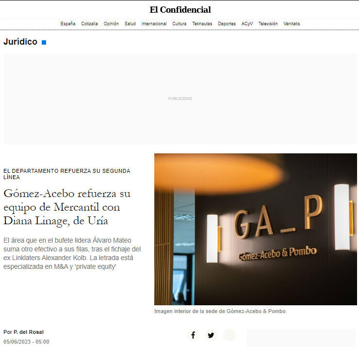 Nuevo fichaje para el área de Mercantil de Gómez-Acebo & Pombo. Como avanzan fuentes del mercado a El Confidencial, la firma ha incorporado a Diana Linage, hasta la fecha asociada senior de Uría Menéndez, como of counsel. La contratación se produce apenas días después de que este diario avanzara el fichaje del ex Linklaters Alexander Kolb por la firma que lidera Íñigo Erlaiz.