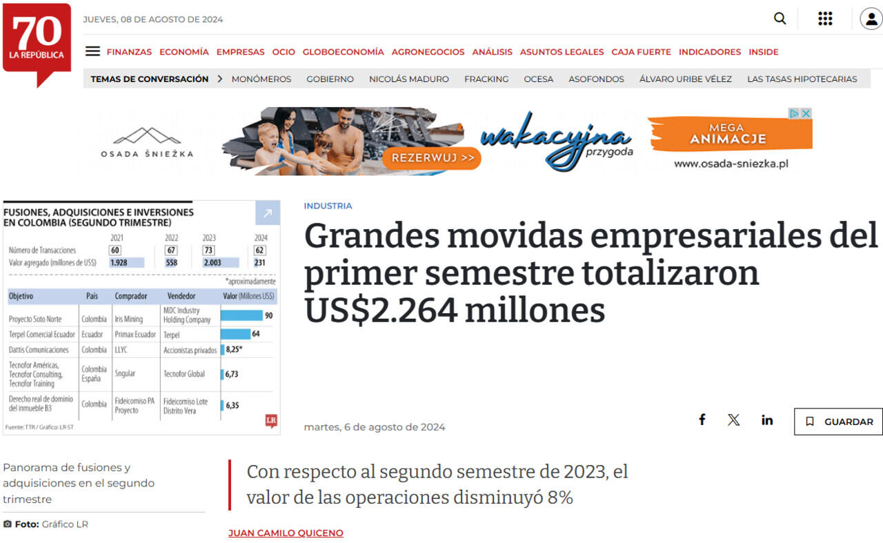 Empresas como Iris Mining, Llorente y Cuenca, LLYC, y Primax están de las movidas empresariales fuertes con corte al segundo trimestre del año. De acuerdo con la plataforma TTR, estas compañías protagonizaron las mayores transacciones del semestre, con una inversión conjunta por el orden de US$162,2 millones.