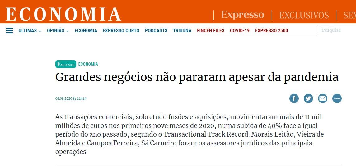 As transações comerciais, sobretudo fusões e aquisições, movimentaram mais de 11 mil milhões de euros nos primeiros nove meses de 2020, numa subida de 40% face a igual período do ano passado, segundo o Transactional Track Record. Morais Leitão, Vieira de Almeida e Campos Ferreira, Sá Carneiro foram os assessores jurídicos das principais operações