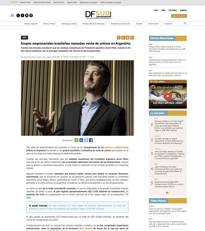 Lo cierto es que ya se están concretando acuerdos, lo que ha impulsado a los grupos brasileños a tomar medidas. De enero a junio, el país registró aproximadamente US$ 3.500 millones en transacciones, un aumento del 62% en comparación con el mismo período de 2024, según datos de la consultora TTR Data.