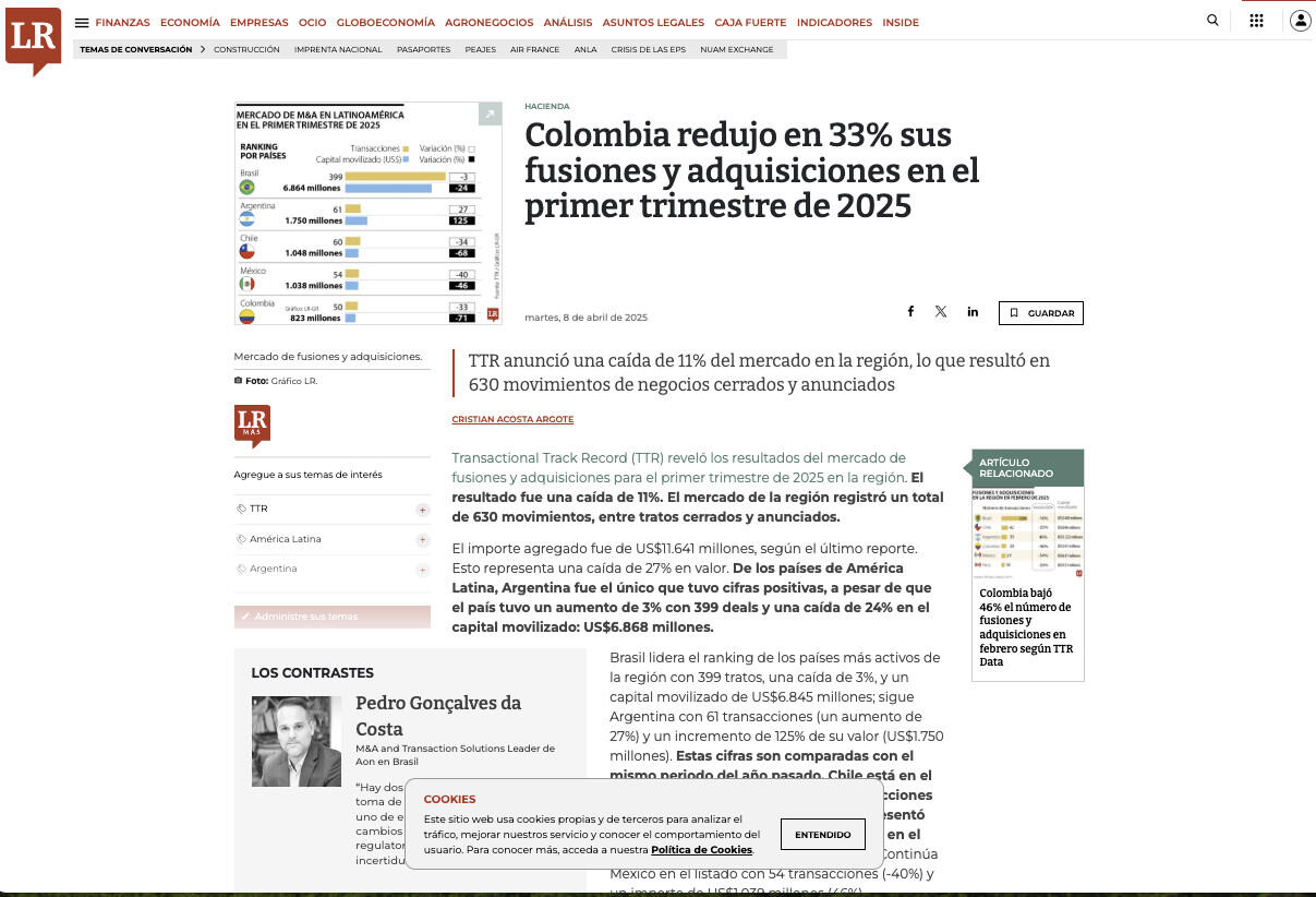 Transactional Track Record (TTR) reveló los resultados del mercado de fusiones y adquisiciones para el primer trimestre de 2025 en la región. El resultado fue una caída de 11%. El mercado de la región registró un total de 630 movimientos, entre tratos cerrados y anunciados.