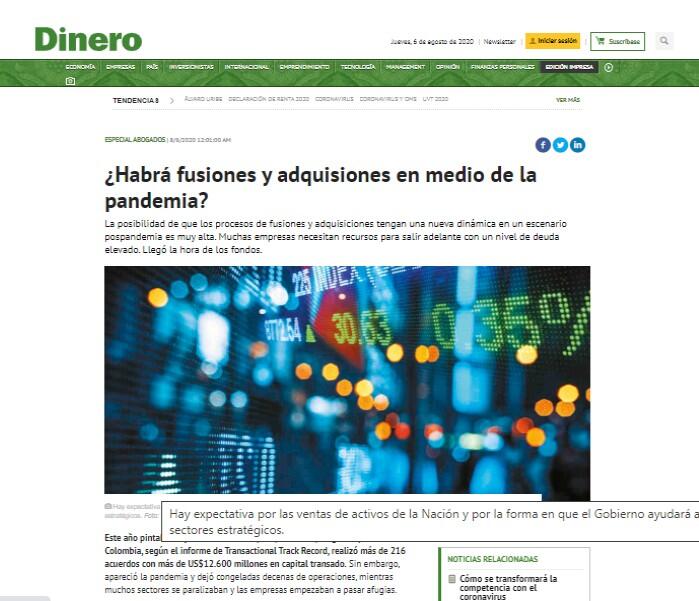 Este año pintaba muy bien en fusiones y adquisiciones, luego de que en 2019 Colombia, según el informe de Transactional Track Record, realizó más de 216 acuerdos con más de US$12.600 millones en capital transado. Sin embargo, apareció la pandemia y dejó congeladas decenas de operaciones, mientras muchos sectores se paralizaban y las empresas empezaban a pasar afugias.