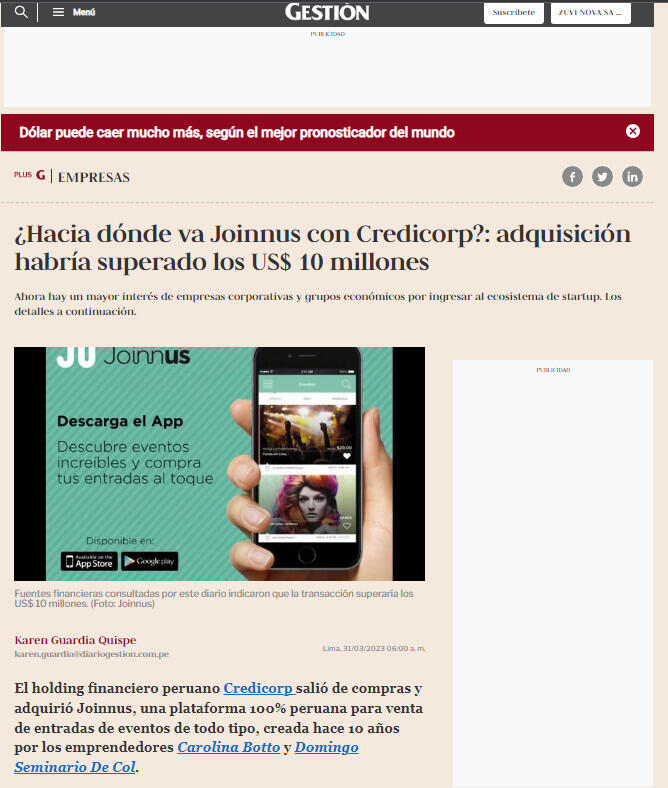 El holding financiero peruano Credicorp salió de compras y adquirió Joinnus, una plataforma 100% peruana para venta de entradas de eventos de todo tipo, creada hace 10 años por los emprendedores Carolina Botto y Domingo Seminario De Col.