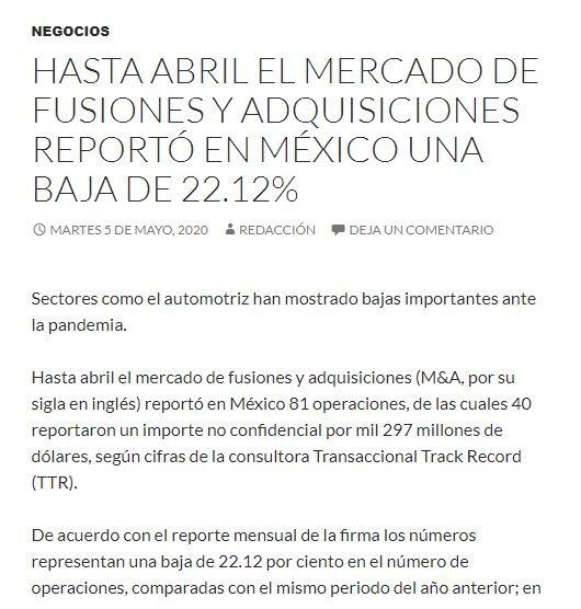 Hasta abril el mercado de fusiones y adquisiciones (M&A, por su sigla en inglés) reportó en México 81 operaciones, de las cuales 40 reportaron un importe no confidencial por mil 297 millones de dólares, según cifras de la consultora Transaccional Track Record (TTR).