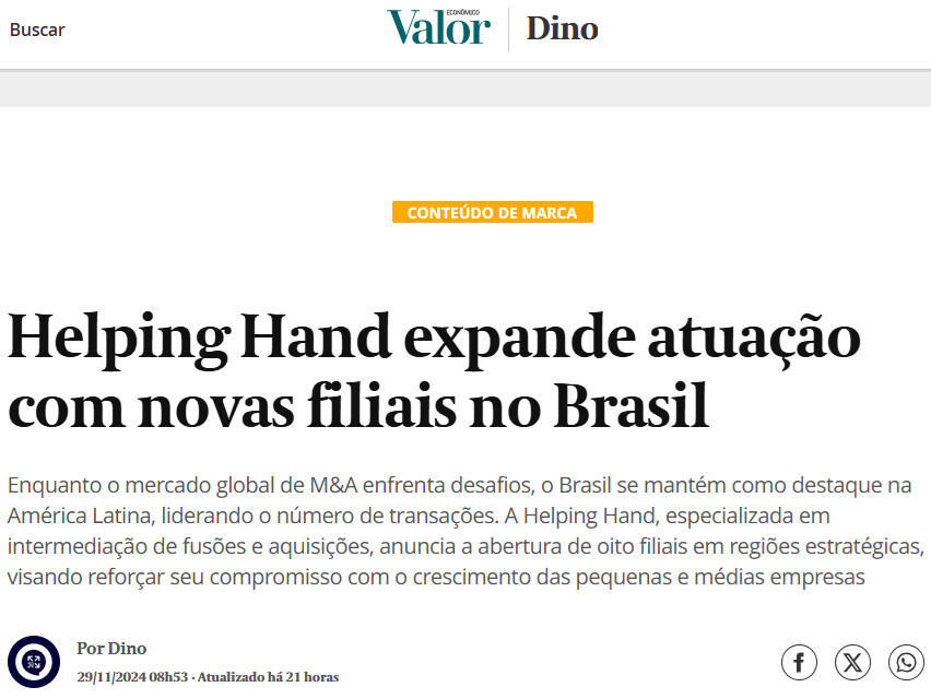 Enquanto o mercado global de M&A enfrenta desafios, o Brasil se mantém como destaque na América Latina, liderando o número de transações. A Helping Hand, especializada em intermediação de fusões e aquisições, anuncia a abertura de oito filiais em regiões estratégicas, visando reforçar seu compromisso com o crescimento das pequenas e médias empresas