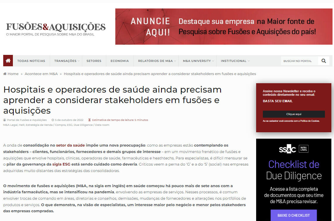 A onda de consolidação no setor da saúde impõe uma nova preocupação: como as empresas estão contemplando os stakeholders – clientes, funcionários, fornecedores e demais grupos de interesse – em um movimento frenético de fusões e aquisições que envolve hospitais, clínicas, operadoras de saúde, farmacêuticas e heathtechs. Para especialistas, é difícil mensurar se o pilar da governança da sigla ESG está sendo cuidado como deveria. Críticos veem a perna do ‘G’ e a do ‘S’ (social) nas empresas adquiridas muito distantes das estratégias das consolidadoras.