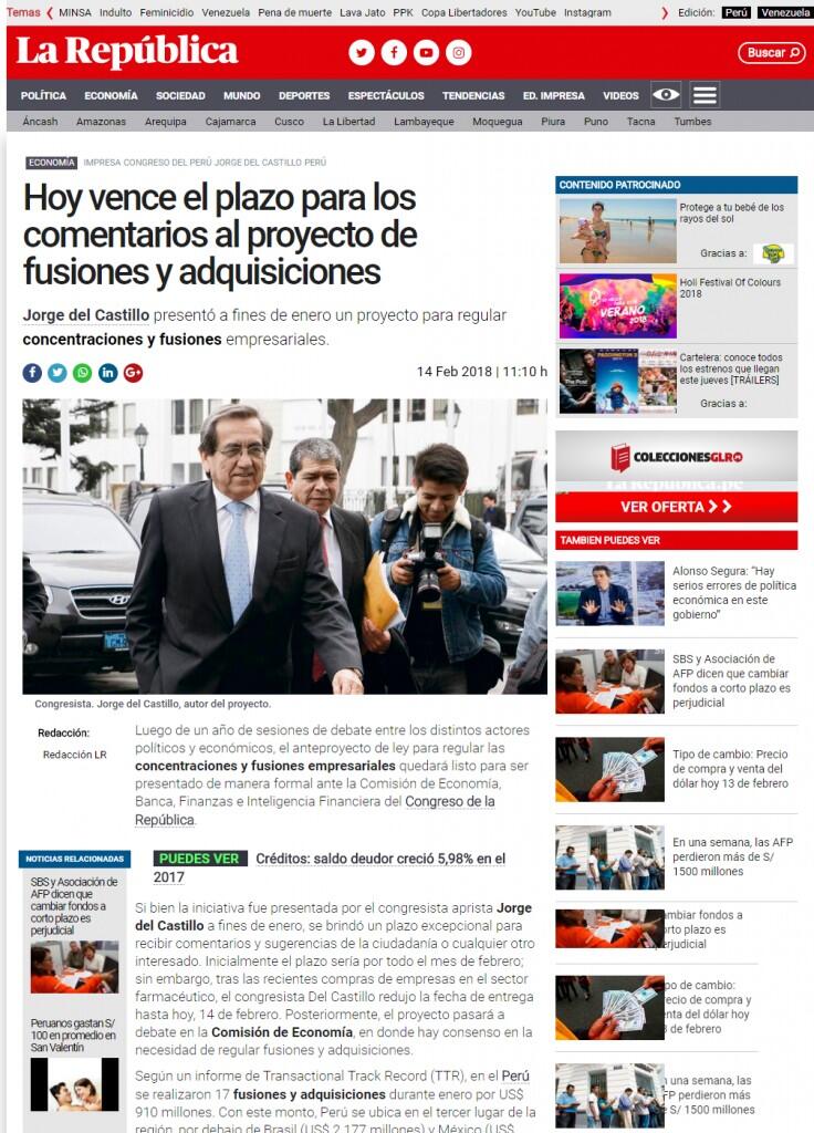 Si bien la iniciativa fue presentada por el congresista aprista Jorge del Castillo a fines de enero, se brindó un plazo excepcional para recibir comentarios y sugerencias de la ciudadanía o cualquier otro interesado. Inicialmente el plazo sería por todo el mes de febrero; sin embargo, tras las recientes compras de empresas en el sector farmacéutico, el congresista Del Castillo redujo la fecha de entrega hasta hoy, 14 de febrero. Posteriormente, el proyecto pasará a debate en la Comisión de Economía, en donde hay consenso en la necesidad de regular fusiones y adquisiciones.