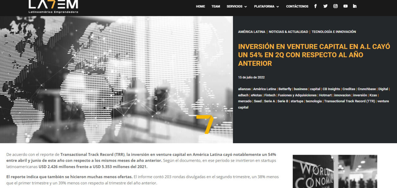 De acuerdo con el reporte de Transactional Track Record (TRR), la inversión en venture capital en América Latina cayó notablemente un 54% entre abril y junio de este año con respecto a los mismos meses de año anterior. Según el documento, en ese período se invirtieron en startups latinoamericanas USD 2.426 millones frente a USD 5.353 millones del 2021.