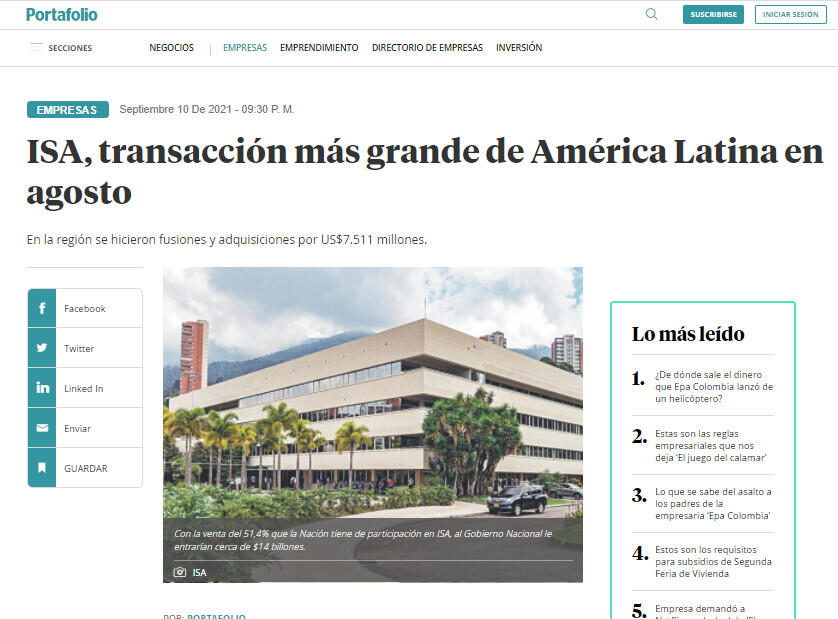 ISA, transacción más grande de América Latina en agosto