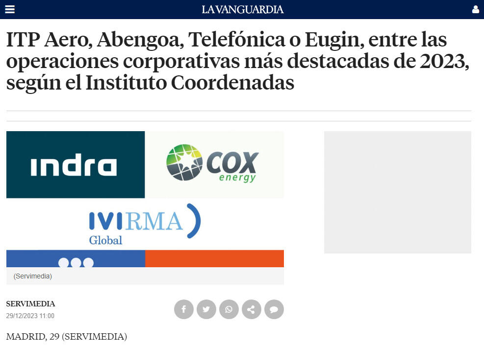 ITP Aero, Abengoa, Telefónica o Eugin están entre las operaciones corporativas más destacadas de 2023, según el Instituto Coordenadas de Gobernanza y Economía Aplicada.