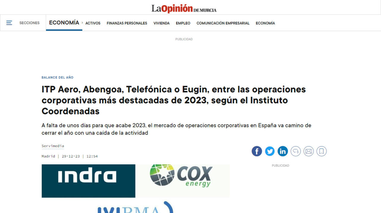 ITP Aero, Abengoa, Telefónica o Eugin están entre las operaciones corporativas más destacadas de 2023, según el Instituto Coordenadas de Gobernanza y Economía Aplicada.