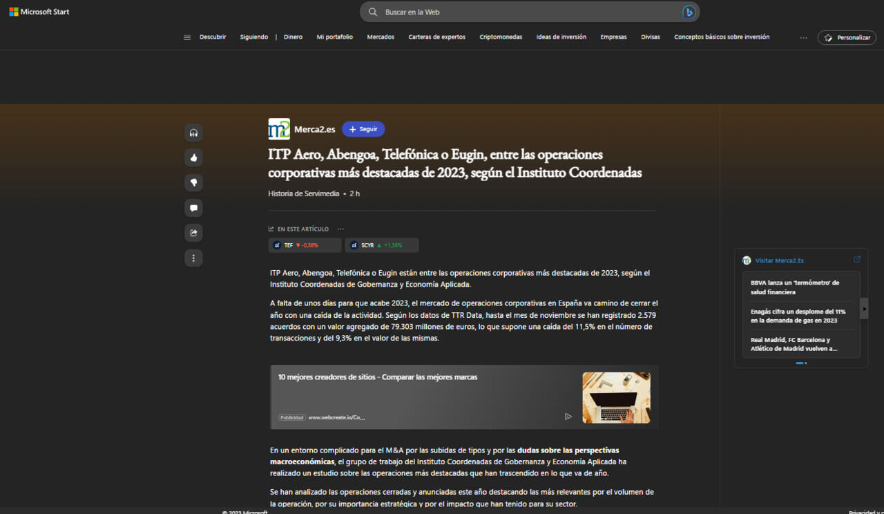 ITP Aero, Abengoa, Telefónica o Eugin están entre las operaciones corporativas más destacadas de 2023, según el Instituto Coordenadas de Gobernanza y Economía Aplicada.