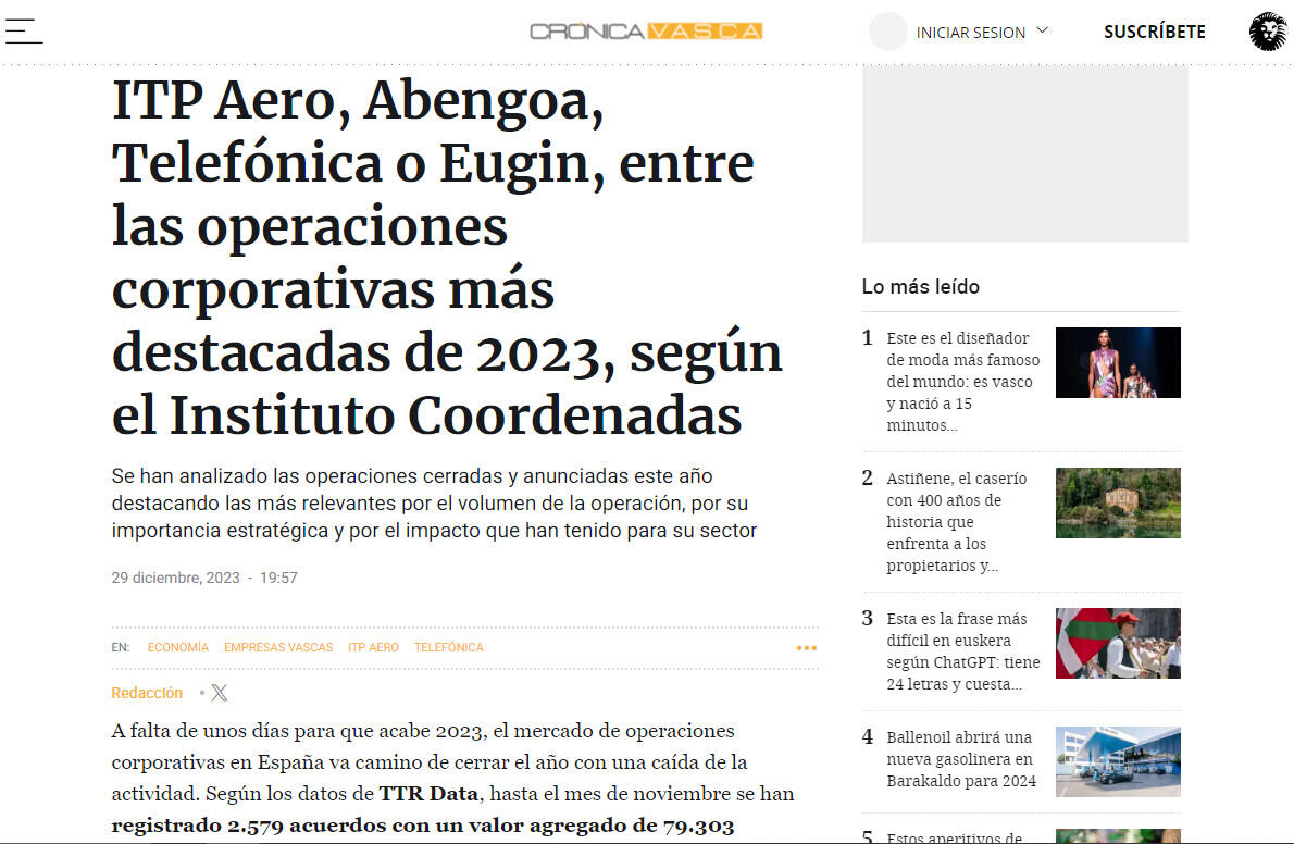 ITP Aero, Abengoa, Telefónica o Eugin, entre las operaciones corporativas más destacadas de 2023, según el Instituto Coordenadas