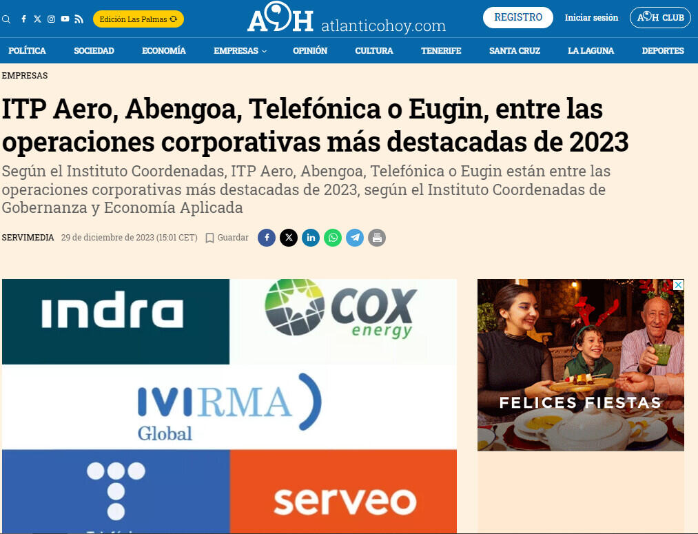 Según el Instituto Coordenadas, ITP Aero, Abengoa, Telefónica o Eugin están entre las operaciones corporativas más destacadas de 2023, según el Instituto Coordenadas de Gobernanza y Economía Aplicada