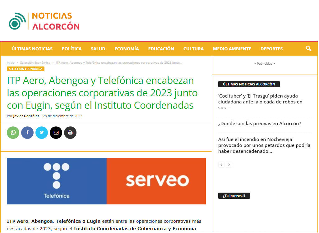 ITP Aero, Abengoa y Telefónica encabezan las operaciones corporativas de 2023 junto con Eugin, según el Instituto Coordenadas