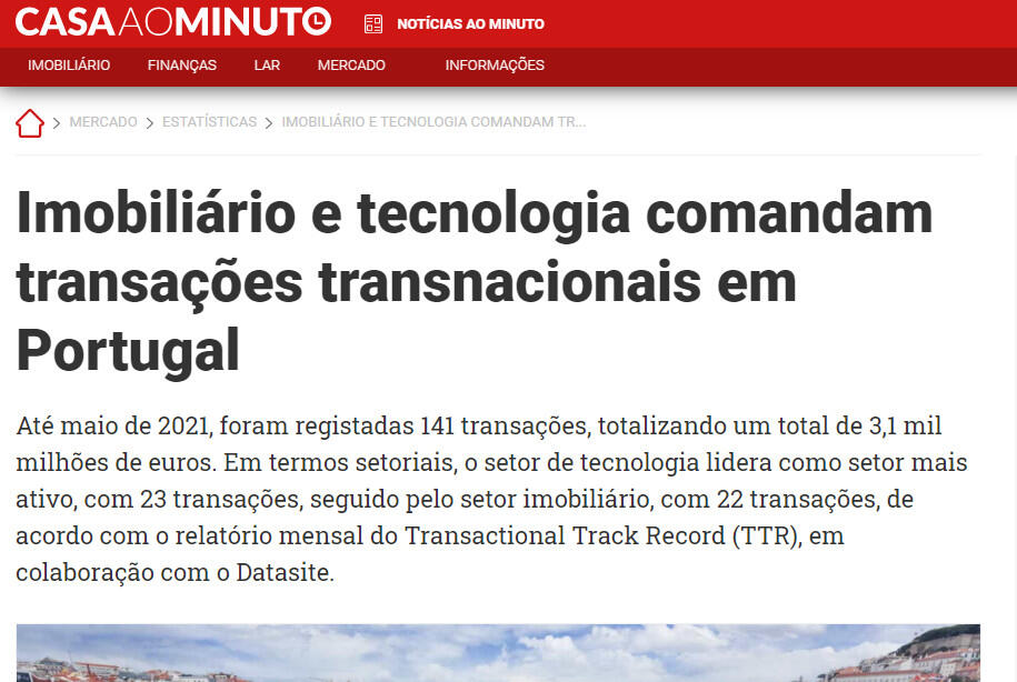 De acordo com o relatório mensal do Transactional Track Record (TTR), em colaboração com o Datasite, o mercado transacional português registou um total de 141 transações e movimentou 3,1 mil milhões de euros, no qual 40% do total das transações possuem os valores revelados. Em termos setoriais, o setor de tecnologia lidera como setor mais ativo, com 23 transações, seguido pelo setor imobiliário, com 22 transações.