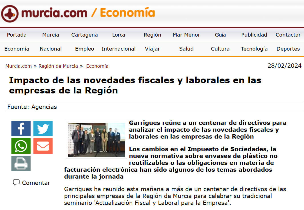 Garrigues ha reunido esta mañana a más de un centenar de directivos de las principales empresas de la Región de Murcia para celebrar su tradicional seminario 'Actualización Fiscal y Laboral para la Empresa'.