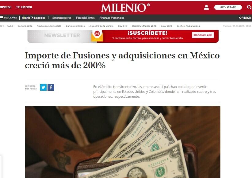 Durante los dos primeros meses del año, el mercado de fusiones y adquisiciones en el país (M&A, por su sigla en inglés) registró 53 transacciones, de las cuales 29 reportaron un importe no confidencial por mil 554 millones de dólares. De acuerdo con el reporte mensual de la consultora Transactional Track Record (TTR), la cifra representó un alza de 13.04 por ciento en el número de negociaciones y de 278.42 por ciento en el importe de las mismas. En lo que va del año, los sectores de Internet, Software y Servicios IT y el Inmobiliario han sido los más activos, con siete transacciones cada uno; detrás de ellos se encuentra el segmento financiero y de Seguros, con seis transacciones. En el ámbito transfronterizo, las empresas del país han optado por invertir principalmente en Estados Unidos y Colombia, donde han realizado cuatro y tres operaciones, respectivamente. En el caso de importe ha destacado Omán, con 620 millones de dólares. En tanto, Estados Unidos ha sido la nación que más ha realizado negociaciones en el país, con 14 transacciones, detrás está Francia, con tres operaciones. En el caso de importe destaca el caso de Estados Unidos, con 362 millones de dólares. TTR destaca que, en el periodo, se han contabilizado 26 operaciones de Venture Capital, por un importe de 537 millones de dólares, lo que significa una variación positiva de 8.33 por ciento en el número de negociaciones y de 156 por ciento en monto. Para el caso de compras de activos, TTR indicó que al segundo mes del año se reportaron en el mercado de M&A ocho operaciones, con un valor por 102 millones de dólares. Dicho dato significa un aumento de 11.11 por ciento en el número de negociaciones y de 298 por ciento en el importe de las mismas. https://www.milenio.com/negocios/importe-fusiones-adquisiciones-mexico-repuntaron-200