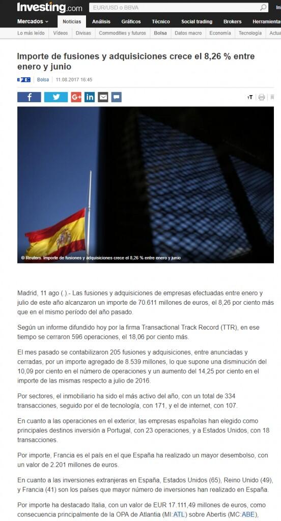 El mes pasado se contabilizaron 205 fusiones y adquisiciones, entre anunciadas y cerradas, por un importe agregado de 8.539 millones, lo que supone una disminución del 10,09 por ciento en el número de operaciones y un aumento del 14,25 por ciento en el importe de las mismas respecto a julio de 2016.