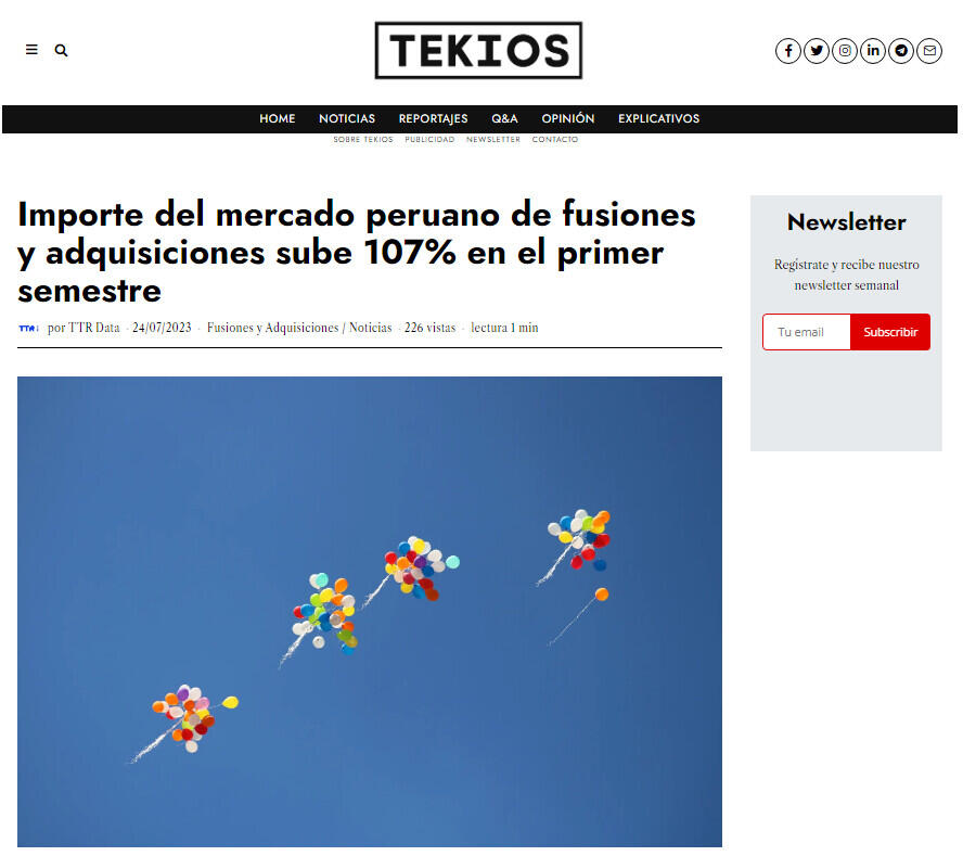 El mercado transaccional peruano ha registrado en el primer semestre de 2023 un total de 58 fusiones y adquisiciones, entre anunciadas y cerradas, por un importe agregado de US$3.656 millones, según el informe trimestral de TTR Data. Estas cifras suponen un descenso del 12% en el número de transacciones y un aumento del 107% en su importe, con respecto al mismo periodo de 2022.