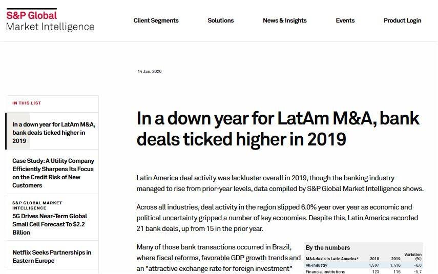 Latin America deal activity was lackluster overall in 2019, though the banking industry managed to rise from prior-year levels, data compiled by S&P Global Market Intelligence shows.