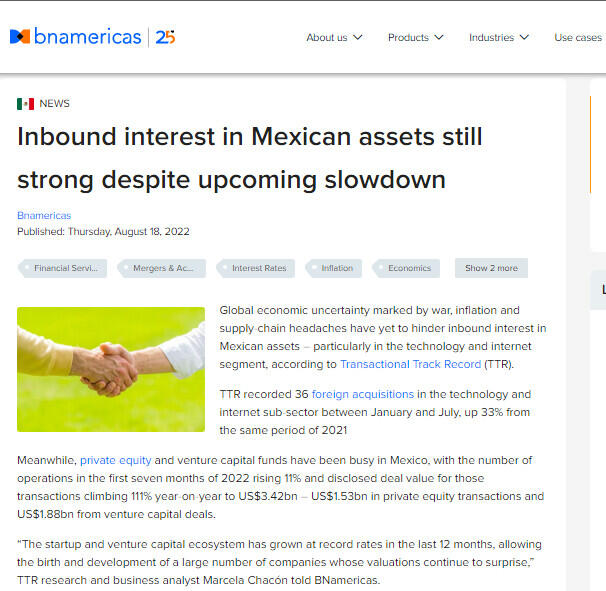 Global economic uncertainty marked by war, inflation and supply-chain headaches have yet to hinder inbound interest in Mexican assets – particularly in the technology and internet segment, according to Transactional Track Record (TTR).