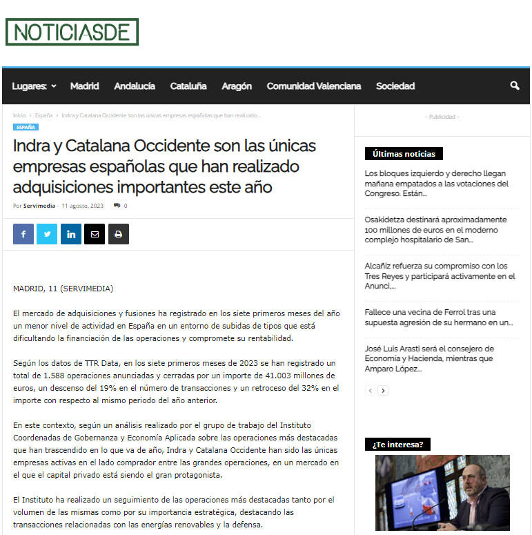 En este contexto, según un análisis realizado por el grupo de trabajo del Instituto Coordenadas de Gobernanza y Economía Aplicada sobre las operaciones más destacadas que han trascendido en lo que va de año, Indra y Catalana Occidente han sido las únicas empresas activas en el lado comprador entre las grandes operaciones, en un mercado en el que el capital privado está siendo el gran protagonista.