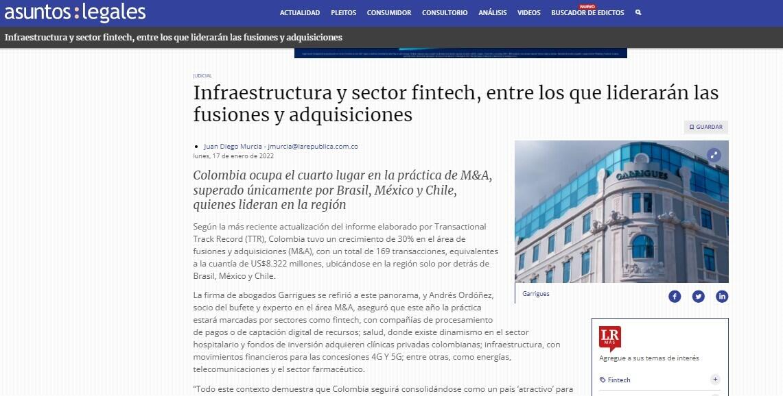 La firma de abogados Garrigues se refirió a este panorama, y Andrés Ordóñez, socio del bufete y experto en el área M&A, aseguró que este año la práctica estará marcadas por sectores como fintech, con compañías de procesamiento de pagos o de captación digital de recursos; salud, donde existe dinamismo en el sector hospitalario y fondos de inversión adquieren clínicas privadas colombianas; infraestructura, con movimientos financieros para las concesiones 4G Y 5G; entre otras, como energías, telecomunicaciones y el sector farmacéutico.