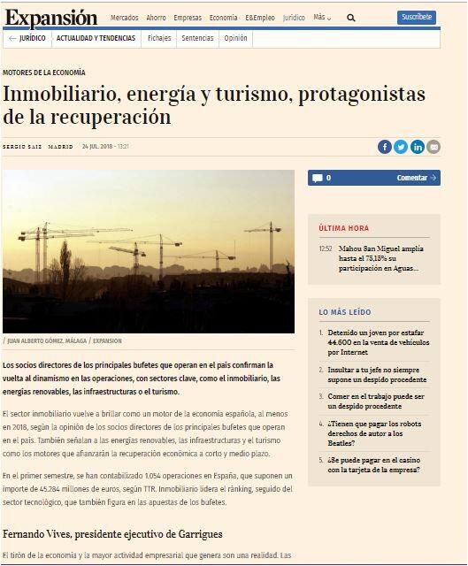 Los sectores con más capacidad de generar inversiones en nuestro país siguen siendo el sector servicios, la construcción, la industria y el turismo, que repuntan y representan una mayor fuerza en nuestra economía. Por otro lado, la generación de nuevos servicios legales está llegando de la mano de inversores extranjeros y por la creciente actividad internacional de las empresas españolas con dimensión global. En este sentido, la internacionalización y la capacidad exportadora de nuestro país también son y serán elementos esenciales que favorecerán el crecimiento durante los próximos meses.