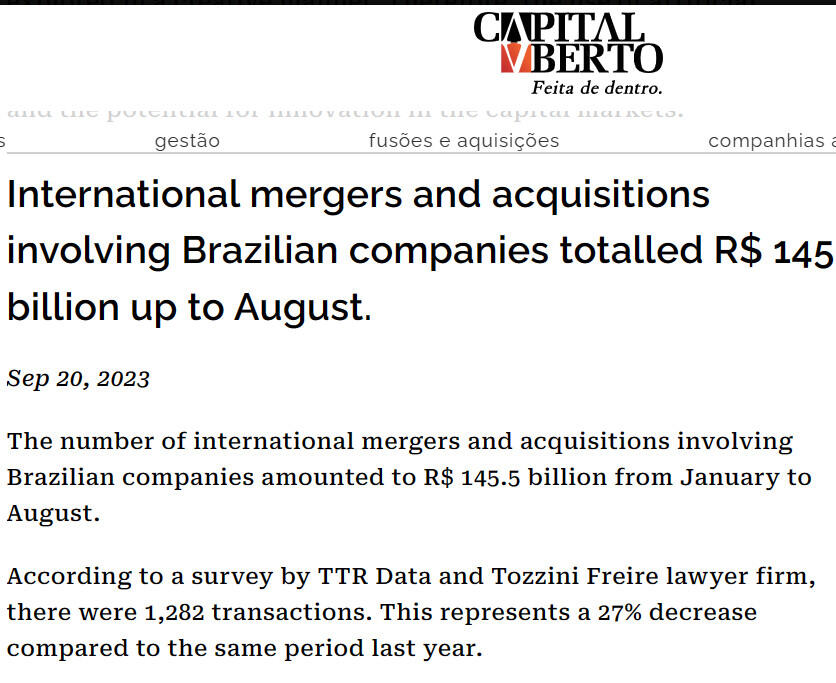 The number of international mergers and acquisitions involving Brazilian companies amounted to R$ 145.5 billion from January to August.