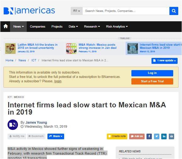 M&A activity in Mexico showed further signs of weakening in February, with research firm Transactional Track Record (TTR) reporting 18 transactions
