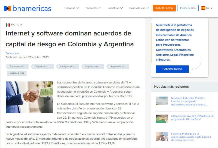 Los segmentos de internet, software y servicios de TI, y software específico de la industria lideraron las actividades de negociación e inversión en Colombia y Argentina, según datos de mercado proporcionados por la consultora TTR.