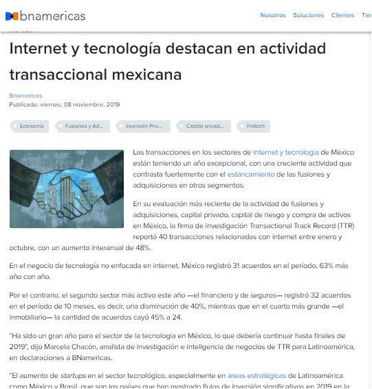 En su evaluación más reciente de la actividad de fusiones y adquisiciones, capital privado, capital de riesgo y compra de activos en México, la firma de investigación Transactional Track Record (TTR) reportó 40 transacciones relacionadas con internet entre enero y octubre, con un aumento interanual de 48%.