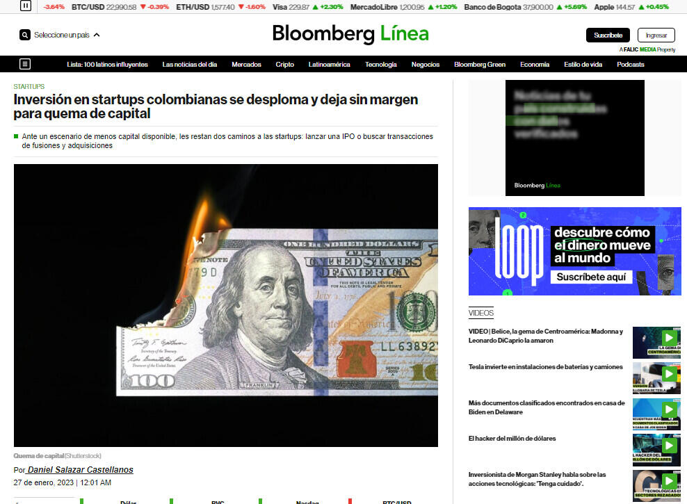 Se estima que la inversión de capital de riesgo en las startups colombianas llegó a los US$1.234 millones en todo el 2022, lo que supuso un desplome del 43,41% frente a 2021, de acuerdo a cifras entregadas a Bloomberg Líne por Transactional Track Record (TTR).