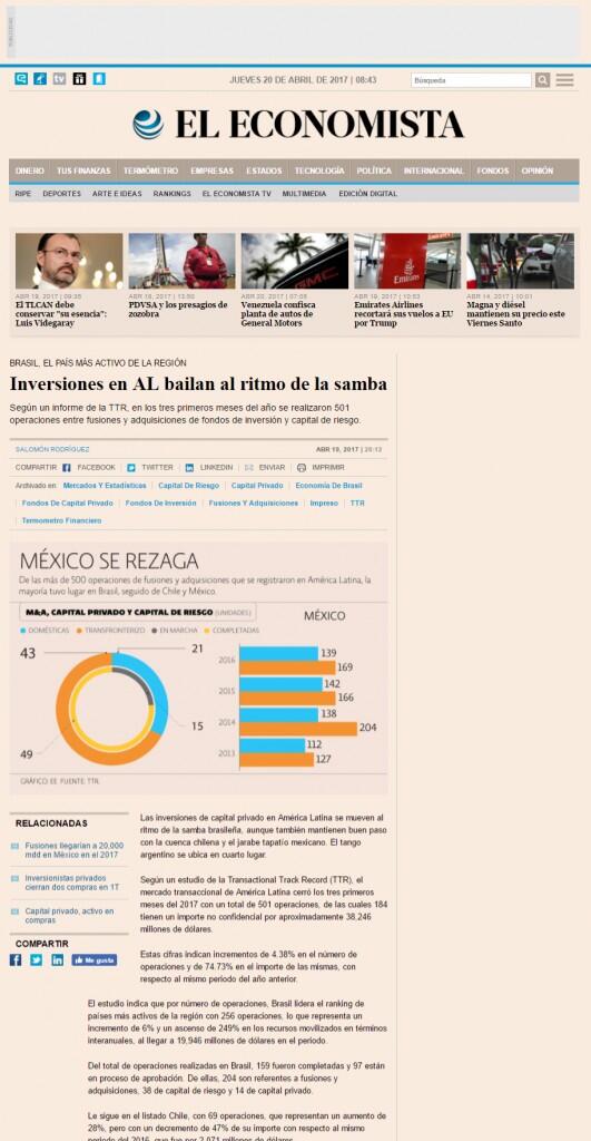 Según un estudio de la Transactional Track Record (TTR), el mercado transaccional de América Latina cerró los tres primeros meses del 2017 con un total de 501 operaciones, de las cuales 184 tienen un importe no confidencial por aproximadamente 38,246 millones de dólares.