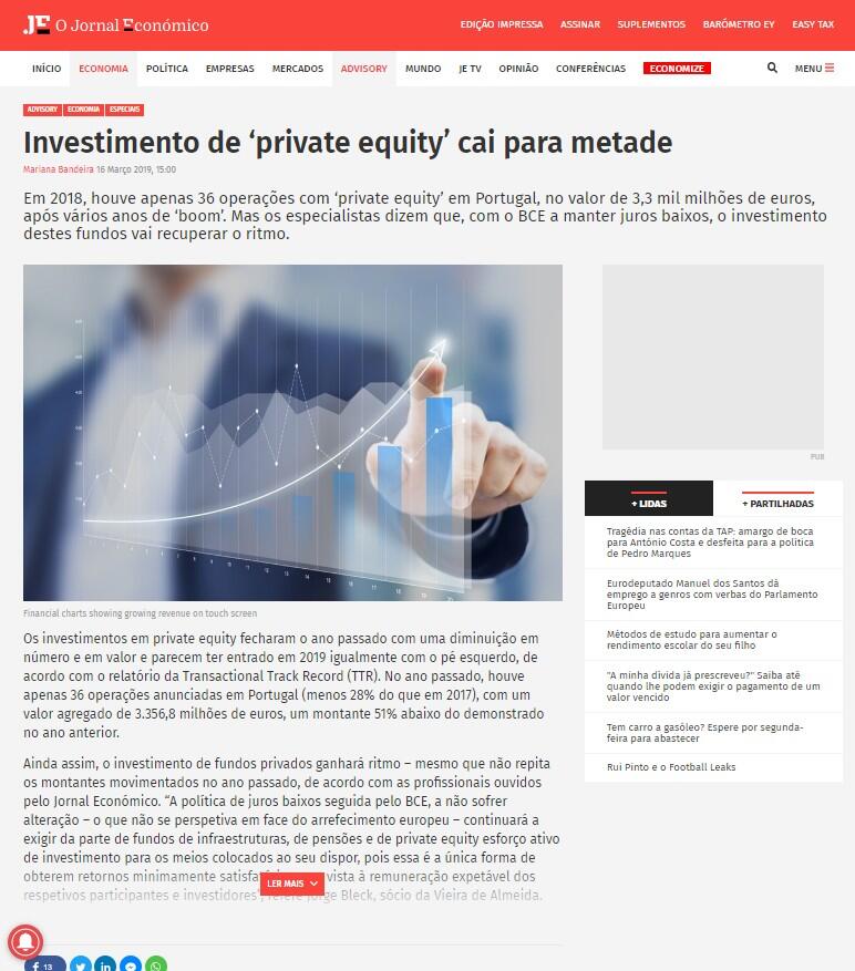 Em 2018, houve apenas 36 operações com ‘private equity’ em Portugal, no valor de 3,3 mil milhões de euros, após vários anos de ‘boom’. Mas os especialistas dizem que, com o BCE a manter juros baixos, o investimento destes fundos vai recuperar o ritmo.