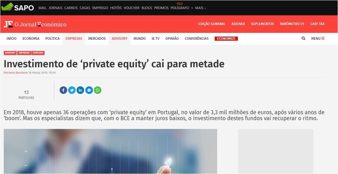 Em 2018, houve apenas 36 operações com ‘private equity’ em Portugal, no valor de 3,3 mil milhões de euros, após vários anos de ‘boom’. Mas os especialistas dizem que, com o BCE a manter juros baixos, o investimento destes fundos vai recuperar o ritmo.
