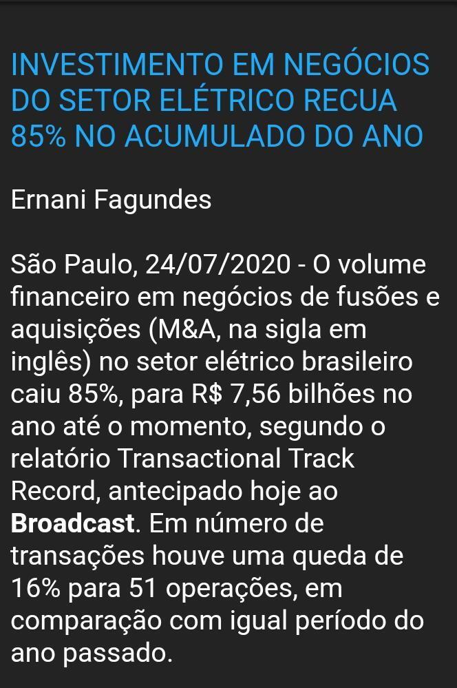 Segundo o relatório, nesse mês de julho se registraram oito transações de fusões e aquisições do setor energético entre anunciadas e concluídas, por um valor total de R$ 1,02 bilhão. O número de transações deste setor se manteve em crescimento desde o início do ano, tendo registrado a máxima em maio com 12 transações e a mínima em junho, com duas. Em relação a valor movimentado, o auge foi no mês de março, com R$ 3,14 bilhões movimentados. Este valor foi alavancado pela transferência do controle acionário da empresa Amazonas Geração e Transmissão de Energia por parte da Eletrobras para a Eletrobras Eletronorte, o valor da transação foi de R$ 3,13 bilhões
