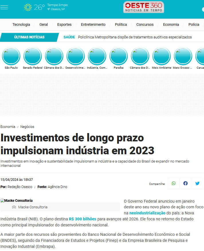 O Governo Federal anunciou em janeiro deste ano seu novo plano de ação com foco na neoindustrialização do país: a Nova Indústria Brasil (NIB). O plano destina R$ 300 bilhões para avanços até 2026. Ele foca no retorno do Estado como principal impulsionador do desenvolvimento nacional.