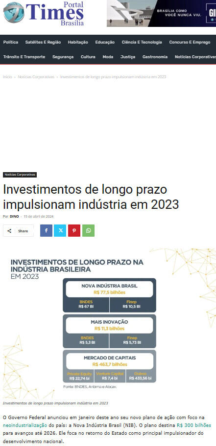 O Governo Federal anunciou em janeiro deste ano seu novo plano de ação com foco na neoindustrialização do país: a Nova Indústria Brasil (NIB). O plano destina R$ 300 bilhões para avanços até 2026. Ele foca no retorno do Estado como principal impulsionador do desenvolvimento nacional.