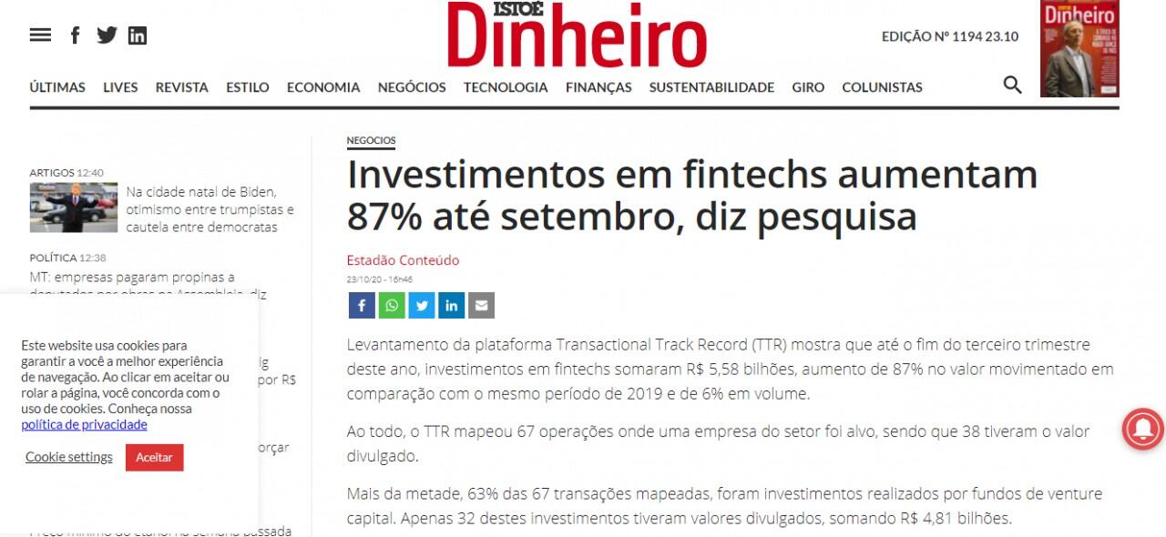 Levantamento da plataforma Transactional Track Record (TTR) mostra que até o fim do terceiro trimestre deste ano, investimentos em fintechs somaram R$ 5,58 bilhões, aumento de 87% no valor movimentado em comparação com o mesmo período de 2019 e de 6% em volume.