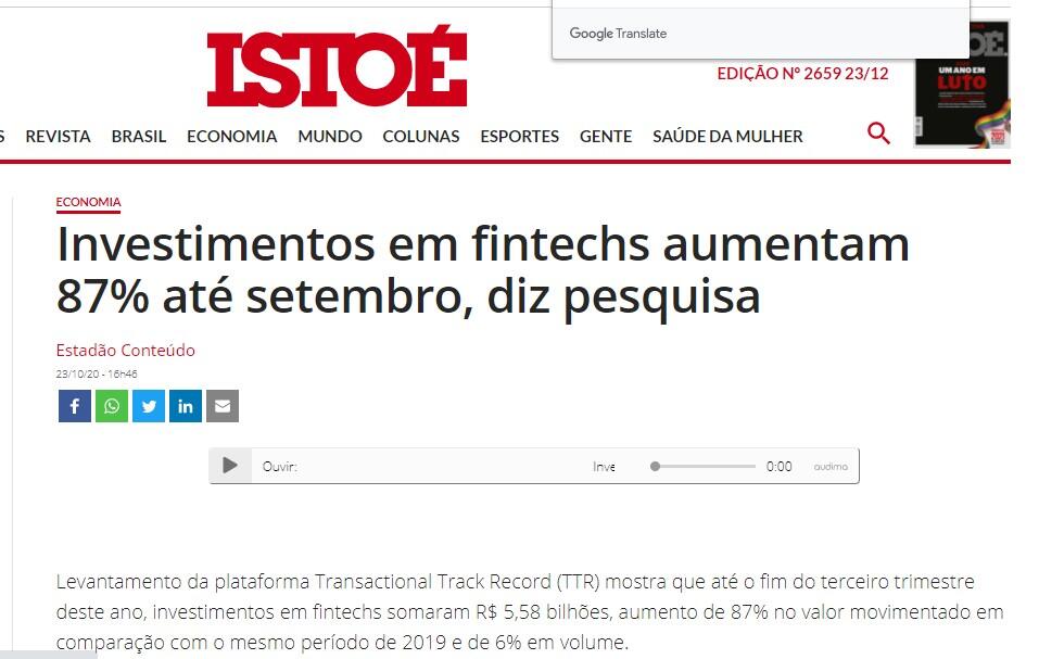 Levantamento da plataforma Transactional Track Record (TTR) mostra que até o fim do terceiro trimestre deste ano, investimentos em fintechs somaram R$ 5,58 bilhões, aumento de 87% no valor movimentado em comparação com o mesmo período de 2019 e de 6% em volume.