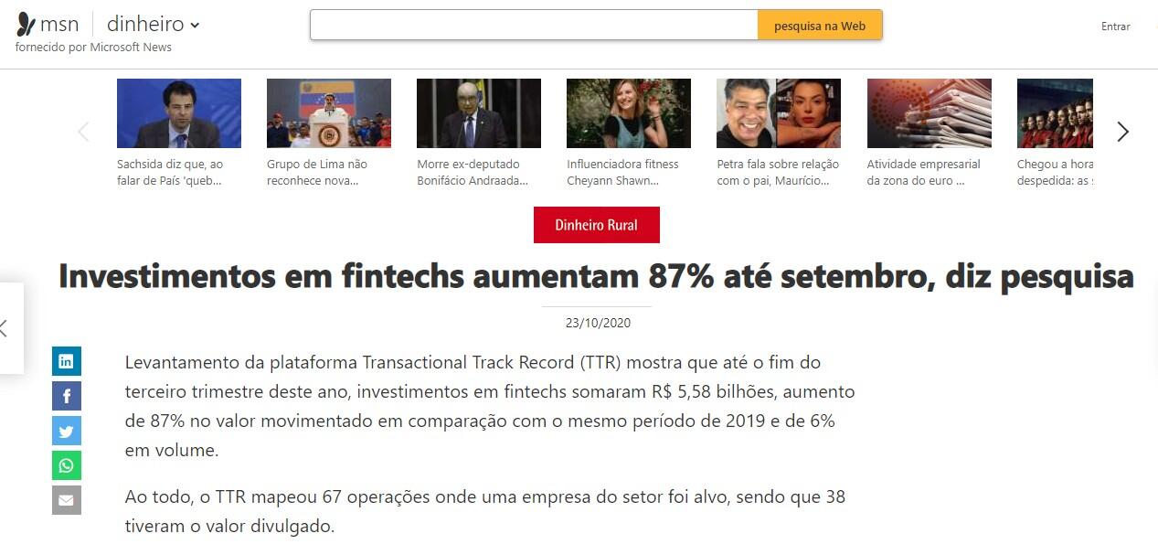 Levantamento da plataforma Transactional Track Record (TTR) mostra que até o fim do terceiro trimestre deste ano, investimentos em fintechs somaram R$ 5,58 bilhões, aumento de 87% no valor movimentado em comparação com o mesmo período de 2019 e de 6% em volume.