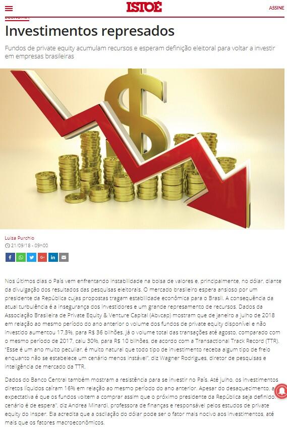 Nos últimos dias o País vem enfrentando instabilidade na bolsa de valores e, principalmente, no dólar, diante da divulgação dos resultados das pesquisas eleitorais. O mercado brasileiro espera ansioso por um presidente da República cujas propostas tragam estabilidade econômica para o Brasil. A consequência da atual turbulência é a insegurança dos investidores e um grande represamento de recursos. Dados da Associação Brasileira de Private Equity & Venture Capital (Abvcap) mostram que de janeiro a julho de 2018 em relação ao mesmo período do ano anterior o volume dos fundos de private equity disponível e não investido aumentou 17,3%, para R$ 36 bilhões. Já o volume total das transações até agosto, comparado com o mesmo período de 2017, caiu 30%, para R$ 10 bilhões, de acordo com a Transactional Track Record (TTR). “Esse é um ano muito peculiar, é muito natural que todo tipo de investimento receba algum tipo de freio enquanto não se estabelece um cenário menos instável”, diz Wagner Rodrigues, diretor de pesquisas e inteligência de mercado da TTR.
