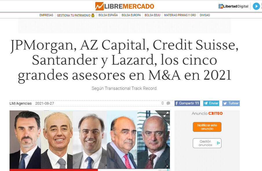 JPMorgan, AZ Capital, Credit Suisse, Santander y Lazard, los cinco grandes asesores en M&A en 2021