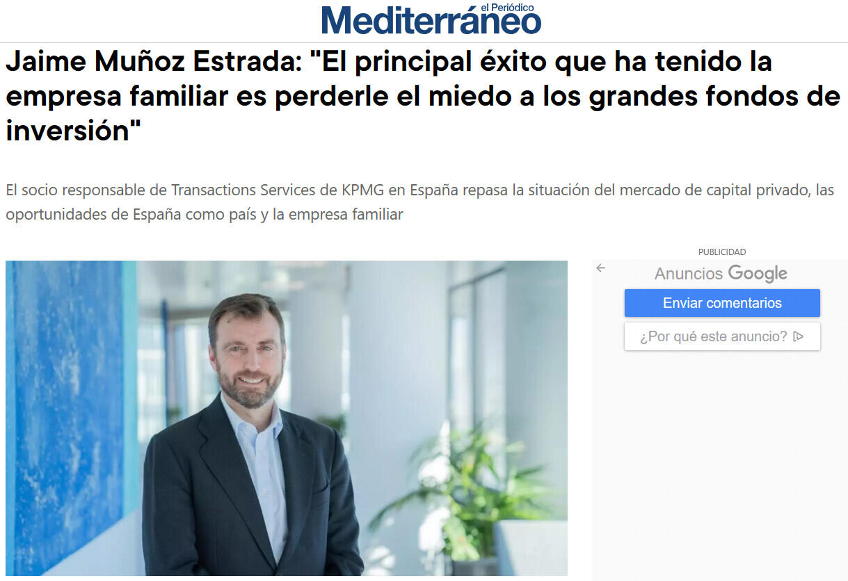 Jaime Muñoz Estrada (Málaga, 1975), socio responsable de Transactions Services de KPMG en España, atiende a ACTIVOS, el vertical económico de Prensa Ibérica, para repasar la situación del mercado del capital privado, la situación de la empresa familiar y el ecosistema de gestoras de fondos de inversión español.